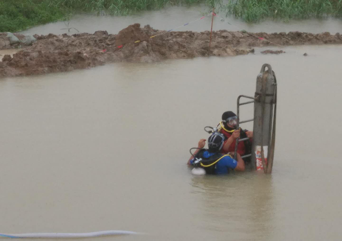 稍作整顿,李峰穿戴好重达40斤的潜水用具,身系安全绳摸索着下到坑底。坑底淤泥堆积,能见度极低,李峰在水坑里来回摸索,找准封堵器三通螺栓,凭借经验确定泄漏点,再爬上来,向项目部反馈情况。